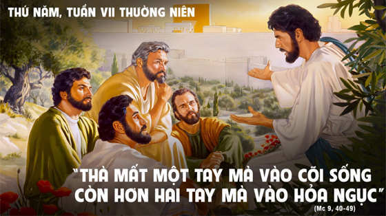 “Nếu tay con nên dịp tội cho con, hãy chặt tay đó đi: thà con mất một tay mà được vào cõi sống, còn hơn là có đủ hai tay mà phải vào hoả ngục, trong lửa không hề tắt. Và nếu chân con làm dịp tội cho con, hãy chặt chân đó đi: thà con mất một chân mà được vào cõi sống, còn hơn là có đủ hai chân mà phải ném xuống hoả ngục. Và nếu mắt con làm dịp tội cho con, hãy móc mắt đó đi, thà con còn một mắt mà vào nước Thiên Chúa, còn hơn là có đủ hai mắt mà phải ném xuống hoả ngục, nơi mà dòi bọ rúc rỉa nó không hề chết và lửa không hề tắt. Vì mọi người sẽ bị ướp bằng lửa.