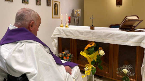 Ngồi trên xe lăn, mặc áo alba trắng và đeo dây stola màu tím, Đức Thánh Cha Phanxicô hướng nhìn lên Thánh giá trên bàn thờ tại nhà nguyện nhỏ trên tầng 10 của bệnh viện Gemelli, nơi ngài thường đến cầu nguyện mỗi ngày kể từ khi sức khỏe có dấu hiệu cải thiện. Đây là hình ảnh đầu tiên của Đức Thánh Cha được công bố từ khi ngài nhập viện hôm 14/2.