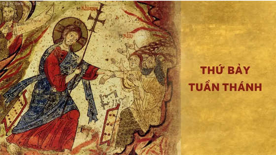“Hôm nay cõi đất chìm trong thinh lặng. Thinh lặng như tờ và hoàn toàn thanh vắng. Thinh lặng như tờ vì Đức Vua đang yên giấc. Cõi đất kinh hãi lặng yên vì Thiên Chúa đã ngủ say trong xác phàm. Người muốn tới viếng thăm những ai ngồi nơi tăm tối và trong bóng tử thần. Thật vậy, trước hết Người đi tìm nguyên tổ như tìm con chiên lạc… Người cầm lấy tay, lay ông dậy và nói: Tỉnh giấc đi, hỡi người còn đang ngủ! Từ chốn tử vong, trỗi dậy đi nào! Đức Kitô sẽ chiếu sáng ngươi.” (Trích một bài giảng cổ về ngày Thứ Bảy Tuần thánh, trong giờ kinh Sách, Thứ Bảy Tuần thánh)