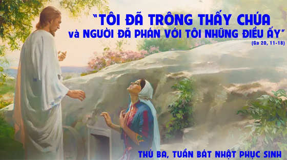 Khi ấy, bà Maria đang còn đứng gần mồ Chúa mà than khóc. Nhìn vào trong mồ, bà thấy hai thiên thần mặc áo trắng đang ngồi nơi đã đặt xác Chúa Giêsu, một vị ngồi phía đàng đầu, một vị ngồi phía đàng chân. Hai vị hỏi: “Tại sao bà khóc?” Bà trả lời: “Người ta đã lấy mất xác Chúa tôi và tôi không biết người ta đã để Người ở đâu?” Vừa nói xong, bà quay mặt lại, thì thấy Chúa Giêsu đã đứng đó, nhưng bà chưa biết là Chúa Giêsu. Chúa Giêsu hỏi: “Bà kia, sao mà khóc, bà tìm ai?” Tưởng là người giữ vườn, Maria thưa: “Thưa ông, nếu ông đã mang xác Người đi, thì xin cho tôi biết ông đã đặt Người ở đâu, để tôi đến lấy xác Người”. Chúa Giêsu gọi: “Maria”. Quay mặt lại, bà thưa Người: “Rabboni!” (nghĩa là “Lạy Thầy!”). Chúa Giêsu bảo bà: “Ðừng động đến Ta, vì Ta chưa về cùng Cha Ta. Nhưng hãy đi báo tin cho các anh em Ta hay và bảo họ rằng: Ta về cùng Cha Ta, cũng là Cha các con; về cùng Thiên Chúa Ta, cũng là Thiên Chúa các con”. Maria Mađalêna đi báo tin cho các môn đệ rằng: “Tôi đã trông thấy Chúa và Chúa đã phán với tôi những điều ấy”.