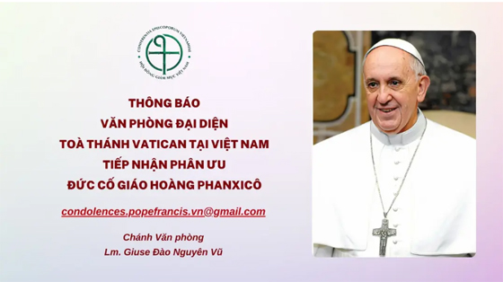 Sau khi Đức Giáo Hoàng Phanxicô trở về Nhà Cha lúc 07g35 giờ Roma (12g45 giờ Việt Nam) Ngày Thứ Hai Tuần Bát Nhật Phục Sinh, 21 tháng 04 năm 2025 và chương trình tổ chức tang lễ đã được công bố, Văn phòng Đại diện Toà Thánh Vatican tại Việt Nam nhận được nhiều tin nhắn, điện thư thăm hỏi và phân ưu. Vì chưa có trụ sở đủ điều kiện để tổ chức lễ viếng và tiếp đón các cá nhân và đoàn thể nên Đức Tổng Giám mục Marek Zalewski, Đại diện thường trú của Toà Thánh Vatican tại Việt Nam đã thông báo với Hội đồng Giám mục Việt Nam địa chỉ email tiếp nhận các điện thư phân ưu qua địa chỉ: