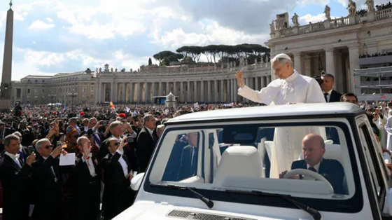 Khoảng 9 giờ sáng, ngài đi xe papamobile ra quảng trường, đám đông hân hoan chào ngài. Ngài ban phép lành cho trẻ em, chào giáo dân, “đắm mình trong đám đông” khoảng 20 phút. Ngài vào phần lãnh thổ Ý đi trên đường Via della Conciliazione trước khi về lại Đền thờ Thánh Phêrô.