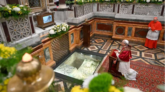 Đến trước bàn thờ Tuyên xưng Đức tin, Đức Thánh Cha đi xuống viếng Mộ Thánh Tông đồ Phaolô và bắt đầu cử hành phụng vụ với Dấu Thánh Giá và lời chào phụng vụ.