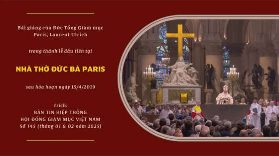 Còn anh em, các giám mục, linh mục, phó tế, các tín hữu của Chúa Kitô, những người đã được rửa tội, những người sống đời thánh hiến, những người phục vụ Tin Mừng theo hoàn cảnh và sứ mạng riêng của mình, anh chị em yêu quý của giáo phận Paris, đừng chỉ choáng ngợp bởi vẻ đẹp của những phiến đá được phục hồi, nhưng hãy để cho mình được dẫn dắt đến những niềm vui lớn nhất, đến món quà cao quý nhất mà Thiên Chúa ban tặng, đó là sự hiện diện yêu thương của Ngài, sự gần gũi của Ngài với những người nghèo khổ nhất, và quyền năng biến đổi của Ngài nơi các bí tích.