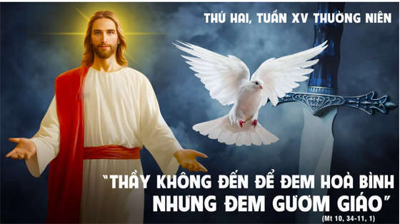 Khi ấy, Chúa Giêsu phán cùng các Tông đồ rằng: “Các con chớ tưởng rằng Thầy đến để mang hoà bình cho thế gian: Thầy không đến để đem hoà bình, nhưng đem gươm giáo. Vì chưng, Thầy đến để gây chia rẽ con trai với cha mình, con gái với mẹ mình, nàng dâu với mẹ chồng mình: và thù địch của người ta lại là chính người nhà mình. Kẻ nào yêu mến cha mẹ hơn Thầy, thì chẳng xứng đáng với Thầy. Kẻ nào yêu con trai con gái hơn Thầy, thì chẳng xứng đáng với Thầy. Kẻ nào không vác thập giá mình mà theo Thầy, thì không xứng đáng với Thầy. Kẻ nào cố tìm mạng sống mình thì sẽ mất, và kẻ nào đành mất mạng sống mình vì Thầy, thì sẽ tìm lại được nó.