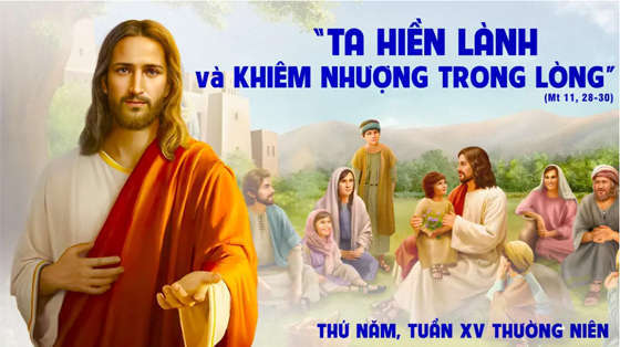 Khi ấy, Chúa Giêsu phán rằng: “Hãy đến với Ta tất cả, hỡi những ai khó nhọc và gánh nặng, Ta sẽ nâng đỡ bổ sức cho các ngươi. Hãy mang lấy ách của Ta và hãy học cùng Ta, vì Ta hiền lành và khiêm nhượng trong lòng, và tâm hồn các ngươi sẽ gặp được bình an. Vì ách của Ta thì êm ái và gánh của Ta thì nhẹ nhàng”.