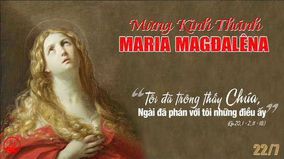 Ngày đầu tuần, Maria Mađalêna đi ra mồ từ sáng sớm khi trời còn tối và bà thấy tảng đá đã được lăn ra khỏi mồ, bà liền chạy về tìm Simon–Phêrô và người môn đệ hác được Chúa Giêsu yêu mến, nói với các ông rằng: “Người ta đã lấy xác Thầy khỏi mồ, và chúng tôi không biết người ta đề Thầy ở đâu”. Bà Maria đang còn đứng gần mồ Chúa mà than khóc, nhìn vào trong mồ, bà thấy hai thiên thần mặc áo trắng đang ngồi nơi đã đặt xác Chúa Giêsu, một vị ngồi phía đàng đầu, một vị ngồi phía đàng chân. Hai vị hỏi: “Tại sao bà khóc”. Bà trả lời: “Người ta đã lấy mất xác Chúa tôi, và tôi không biết người ta đã đề Người ở đâu?, Vừa nói xong, bà quay mặt lại, thì thấy Chúa Giêsu đã đứng đó. Nhưng bà chưa biết là Chúa Giêsu. Chúa Giêsu hỏi: “Bà kia, sao mà khóc, bà tìm ai?” Tưởng là người giữ vườn, Maria thưa: “Thưa ông, nếu ông đã mang xác Người đi, thì xin cho tôi biết ông đã đặt Người ở đâu, đề tôi đến lấy xác Người”. Chúa Giêsu gọi: “Maria”. Quay mặt lại, bà thưa Người: “Rabboni”, nghĩa là: “Lạy Thầy”. Chúa Giêsu bảo bà: “Đừng động đến Ta, vì Ta chưa về cùng Cha Ta. Nhưng hãy báo tin cho các anh em Ta hay và bảo họ rằng: “Ta về cùng Cha Ta, là Cha các con; về cùng Thiên Chúa Ta, cũng là Thiên Chúa các con”. Maria Mađalêna đi báo tin cho các môn đệ rằng: “Tôi đã trông thấy Chúa và Chúa đã phán với tôi những điều ấy”.