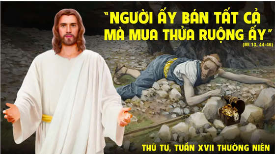 Khi ấy, Chúa Giêsu phán cùng dân chúng rằng: “Nước trời giống như kho tàng chôn giấu trong ruộng, người kia tìm được, vội chôn vùi xuống, vui mừng trở về bán tất cả những gì anh có mà mua thửa ruộng ấy. Nước trời cũng giống như người buôn nọ đi tìm ngọc quý. Tìm được một viên ngọc quý, anh trở về bán mọi của cải mà mua viên ngọc ấy.
