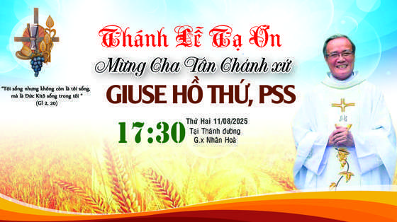 Thánh lễ Tạ Ơn Mừng Cha Tân Chánh Xứ Giuse Hồ Thứ, PSS. Lúc 17giờ30 ngày 11.08.2025. tại Giáo xứ Nhân Hoà. Được trực tiếp để phục vụ: Bệnh nhân, những người đau yếu, tản tật không thể đến nhà thờ được! Kính mời quý anh chị cùng hiệp thông cầu nguyện.